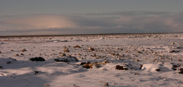 Ours polaire ou roche polaire? La lumière est faible en ce moment et en dehors de la ville, près de la baie, le terrain est plutôt rocailleux. En plus, l’ours blanc n’est en fait pas vraiment blanc, et comme il a tendance à dormir beaucoup à cette période de l’année, il est facile de prendre une roche polaire pour un ours… et vice versa. D’où la question usuelle à Churchill : ours ou roche polaire?