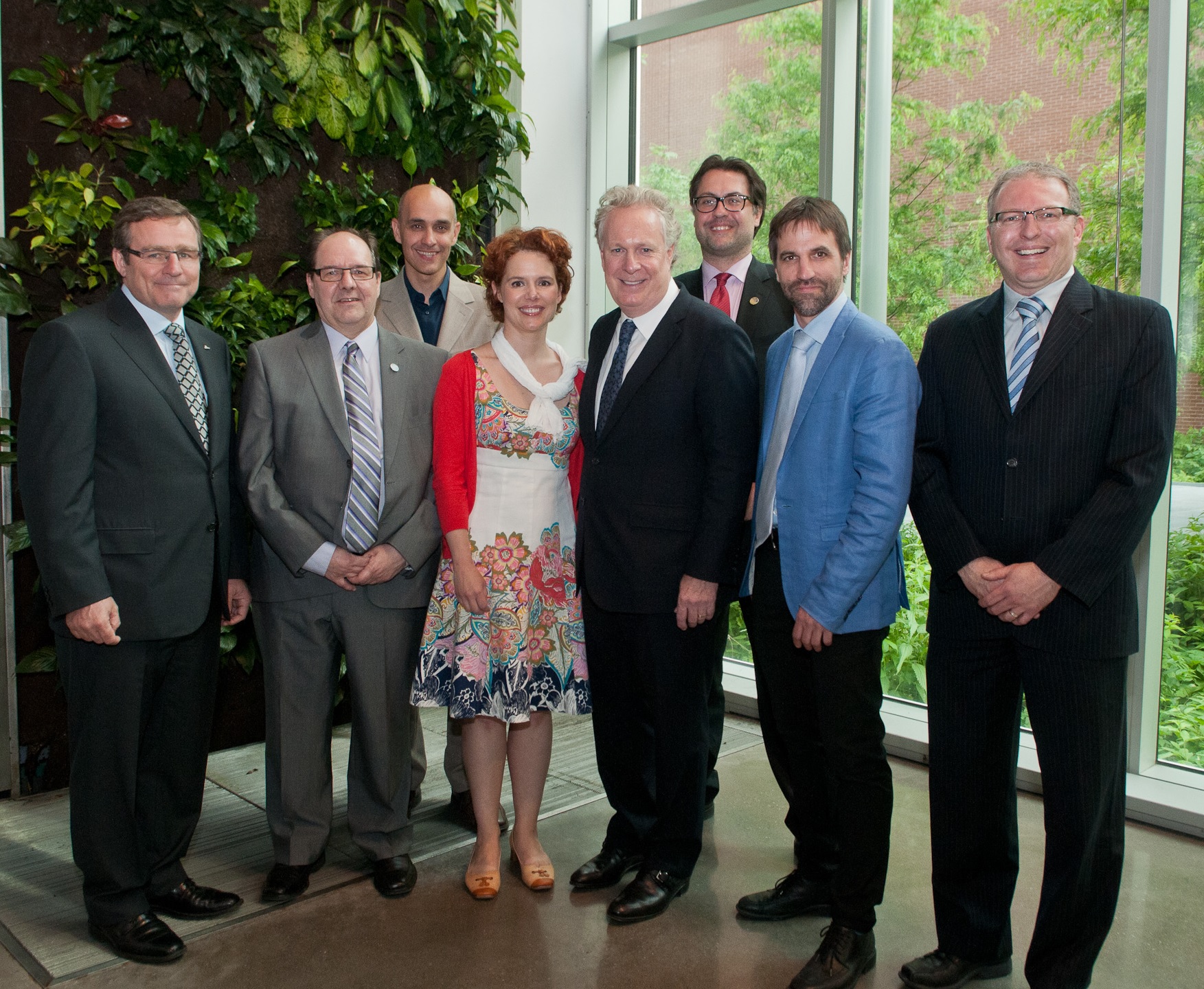 Au milieu Jean Charest, Associé chez Mc Carthy-Tétreault et ancien premier ministre du Québec avec Marie-Claude Lemieux, directrice du Fonds mondial pour la nature au Québec, Sidney Ribaux, Cofondateur, directeur général d’Équiterre, Mario Plourde, président et chef de la direction de Cascades, Pierre Patry, trésorier de la CSN, David Heurtel, ministre du Développement durable, de l’Environnement et de la Lutte contre les changements climatiques, Steven Guilbeault, cofondateur et directeur principal d’Équiterre, et Karel Mayrand, directeur de la Fondation David Suzuki au Québec. © Benoit Desjardins