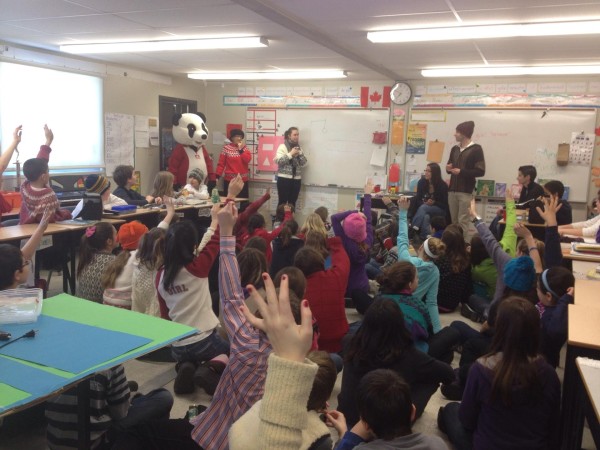 Le panda et nous avons eu la chance de nous faire accompagner par Liliane Day, grand-mère de la Journée de la p’tite laine et membre du l’équipe de l’Initiative boréale canadienne, dont le bureau est voisin du nôtre. Liliane a eu beaucoup de succès auprès des enfants, à qui elle a expliqué à quoi sert la Journée de la p’tite laine du WWF. Nous avons ensuite joué à un jeu sur les expressions comme réchauffement climatique et espèces en danger, puis nous avons demandé aux enfants de nous dire ce que ces expressions veulent dire pour eux. Nous avons tous été très impressionnés de voir autant de mains se lever pour répondre et nous raconter ce que chacun fait à la maison pour économiser l’énergie.