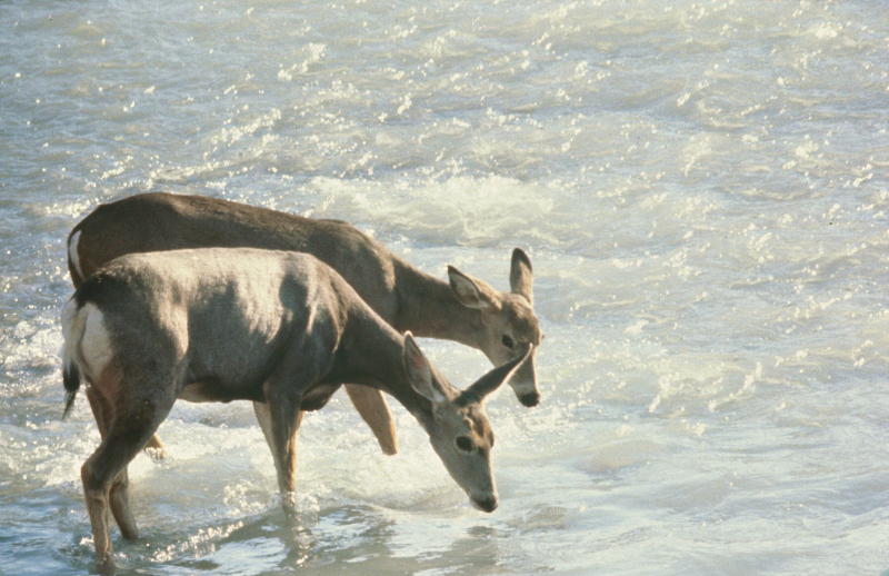Deux cerfs mulet (Odocoileus hemionus) s’abreuvant dans la rivière Athabasca